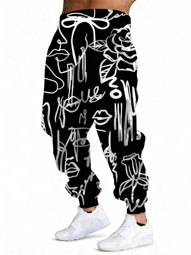 New Men's 3D Graffiti Print Casual Pants Outdoor Breathable Athletic Pants Stylish Drawstring Streetwear Trousers Mens Cuffed Pa