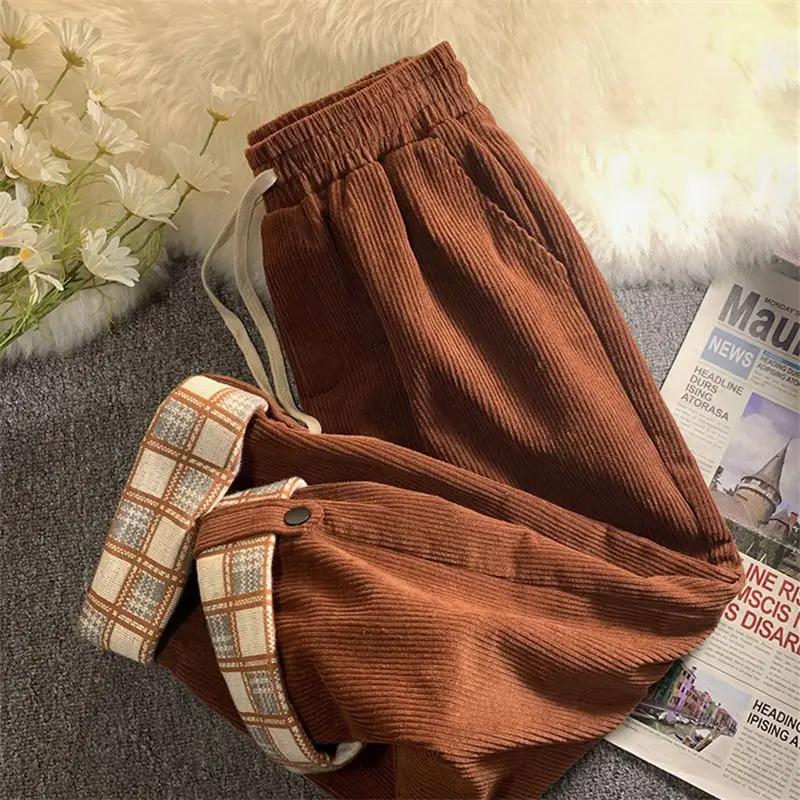 Fashion Plaid Corduroy Wide Leg Pants High Waist Elastic Loose Korean Casual Trousers Spring Fall Drawstring Straight Pants