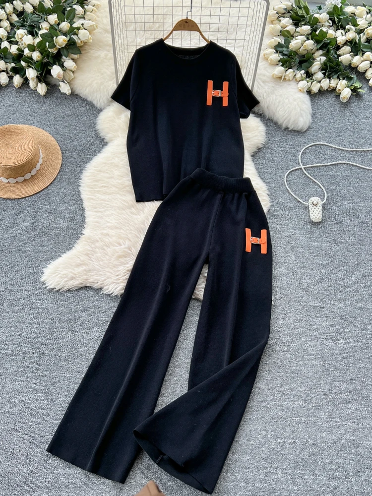 Leisure Knitted Set 2025 Summer Fashion Letter Embroidered Sweater and Wide Leg Pants Set Two Piece Set
