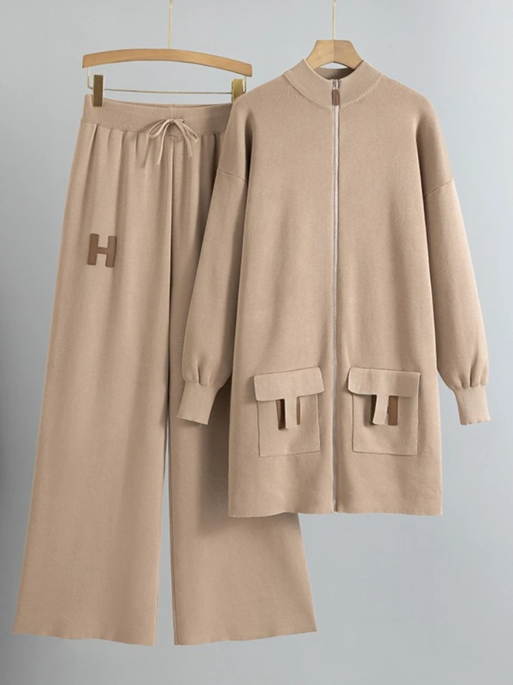 European and American style suit zipper loose knit sweater long top+drawstring wide leg pants casual temperament 2piece set