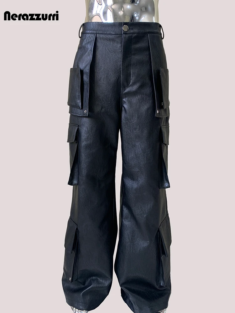 Nerazzurri Autumn Baggy Black Pu Leather Wide Leg Cargo Pants Men with Many Pockets Luxury Designer Emo European Streetwear 2025
