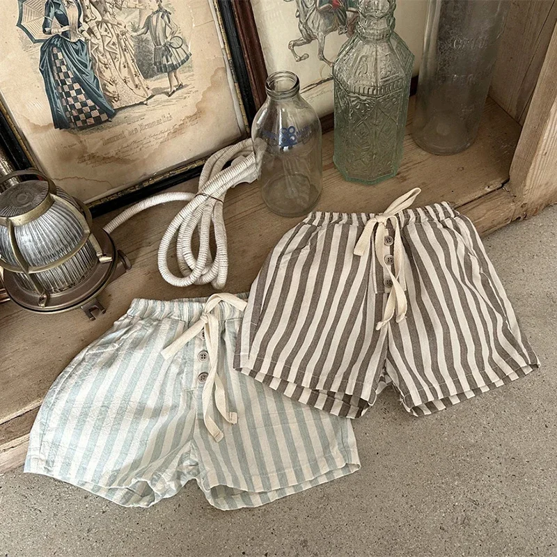 New0-3Yers Vintage Linen Cotton Baby Boys Stripe Shorts Casual Buttons Pocket Design Baby Short Pants for Toddler Girls Clothing