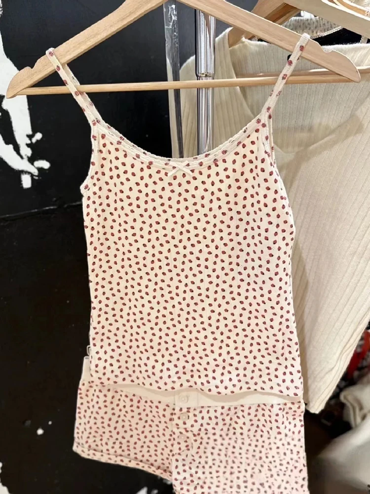 Strawberry Print Eyelet Short Sets Summer Sweet Bow Camis+ Button Shorts 2 Pieces Sets Vintage Cute Slim Two Piece Set For Women