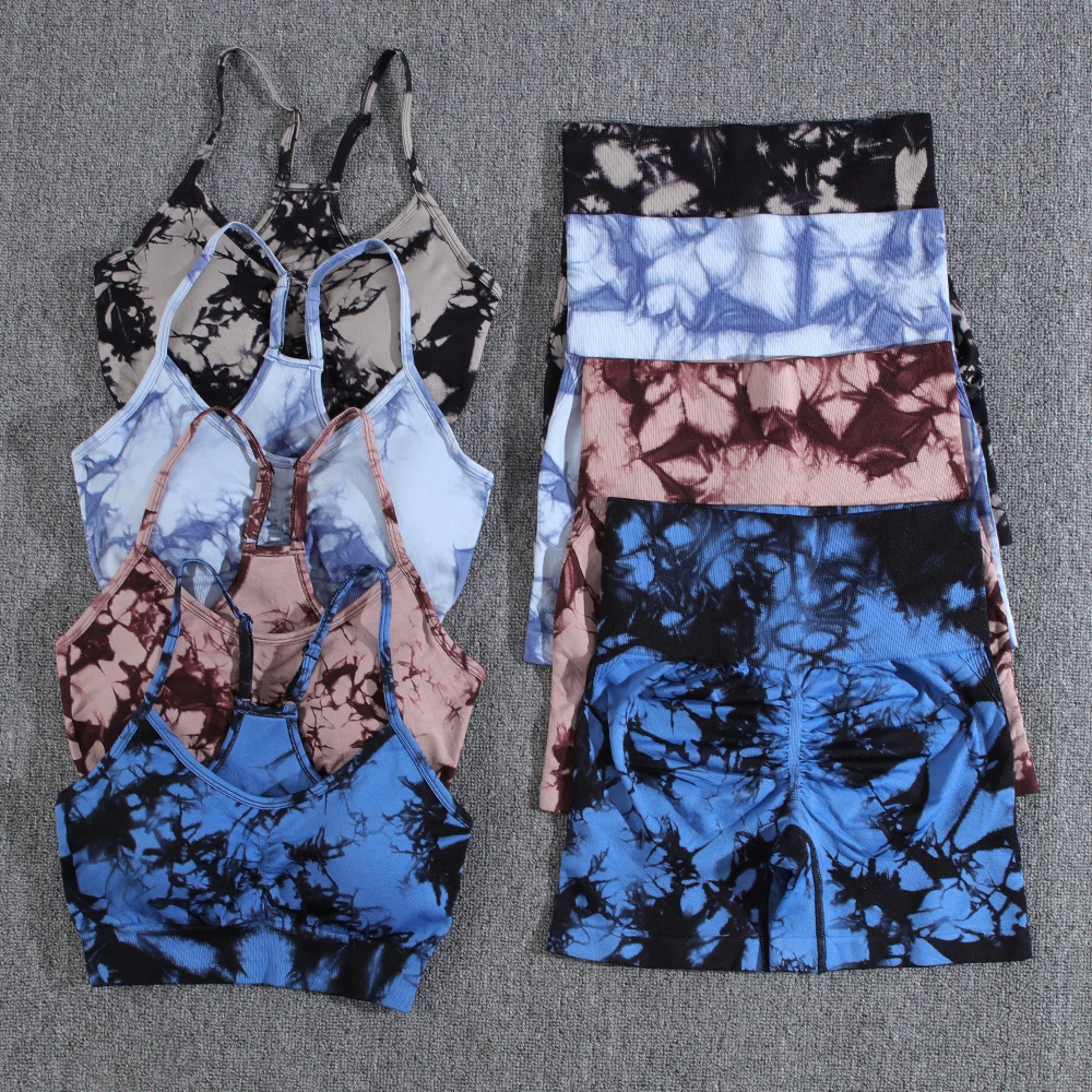 Tie Dye Summer Gym Fitness Shorts Sets Seamless Contrast Color Casual High Waist 2PCS