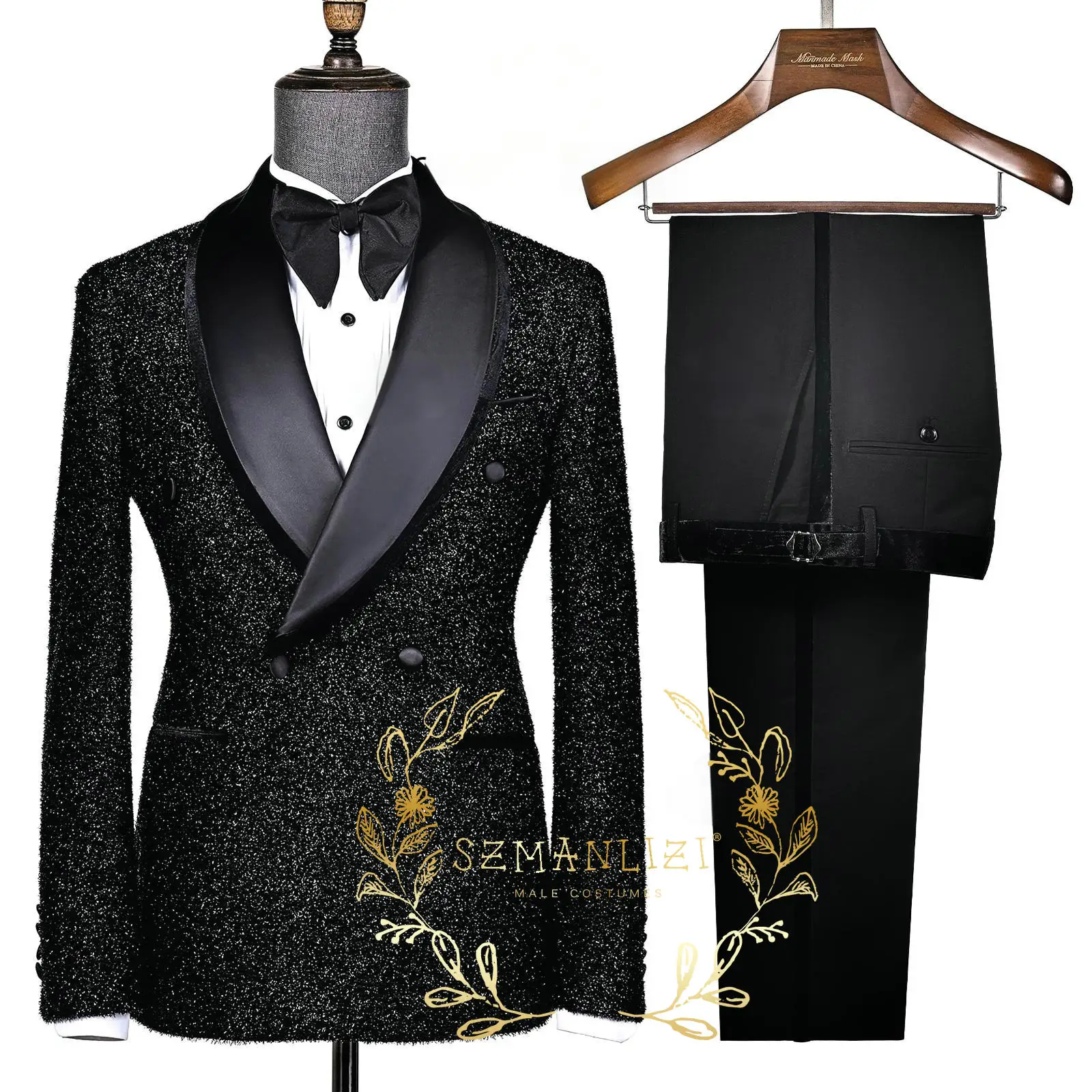 Fashion Shiny Black Men's Suits Slim Fit Double Breasted Shawl Lapel 2 Piece Jacket Pants Male Clothing Prom Party Outfits