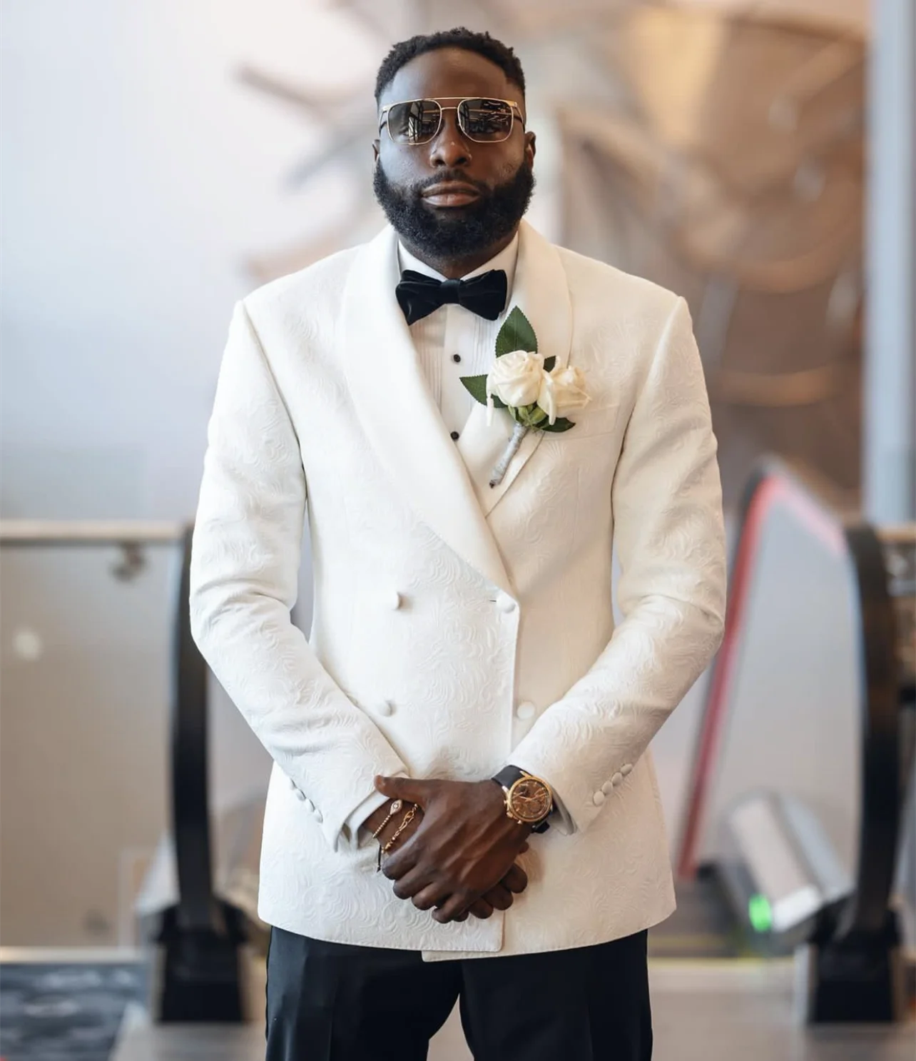 Double Breasted Men Suits Ivory Print/Black Groom Tuxedos Peak Lapel Groomsmen 2 Pieces Set ( Jacket + Pants + Bow Tie ) D501  Read more