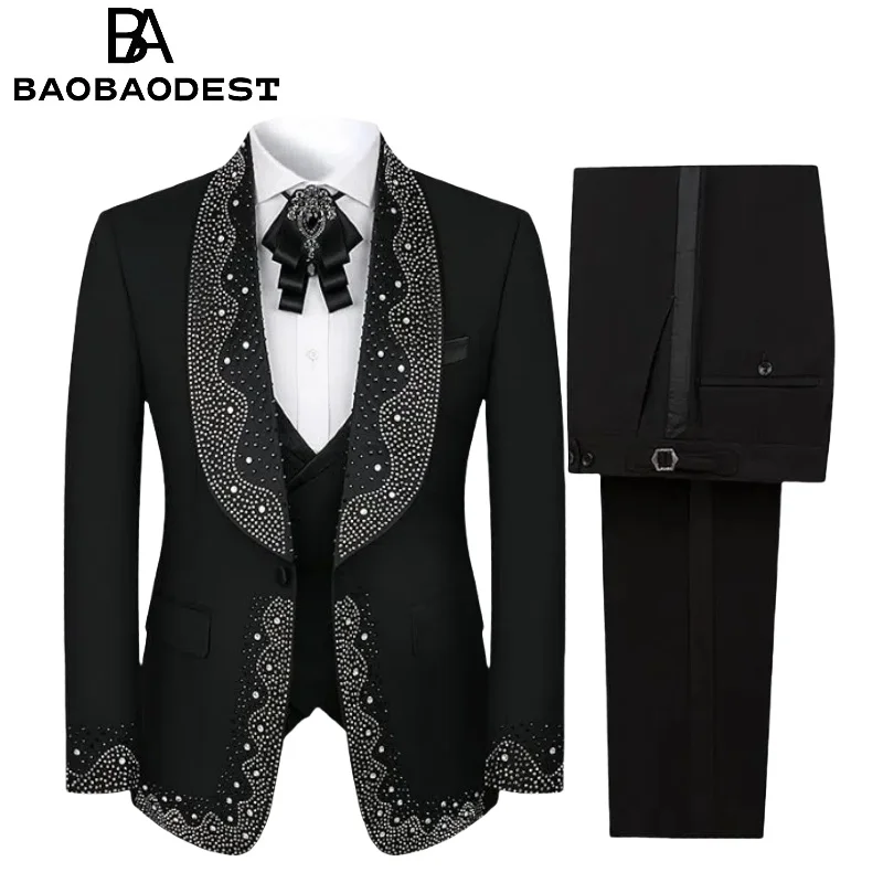 Men's 3-Piece Luxury Diamond Shawl Lapel Tuxedo Set | Black Wedding Suit (Blazer+Vest+Pants) for Groom/Prom Red Carpet Events