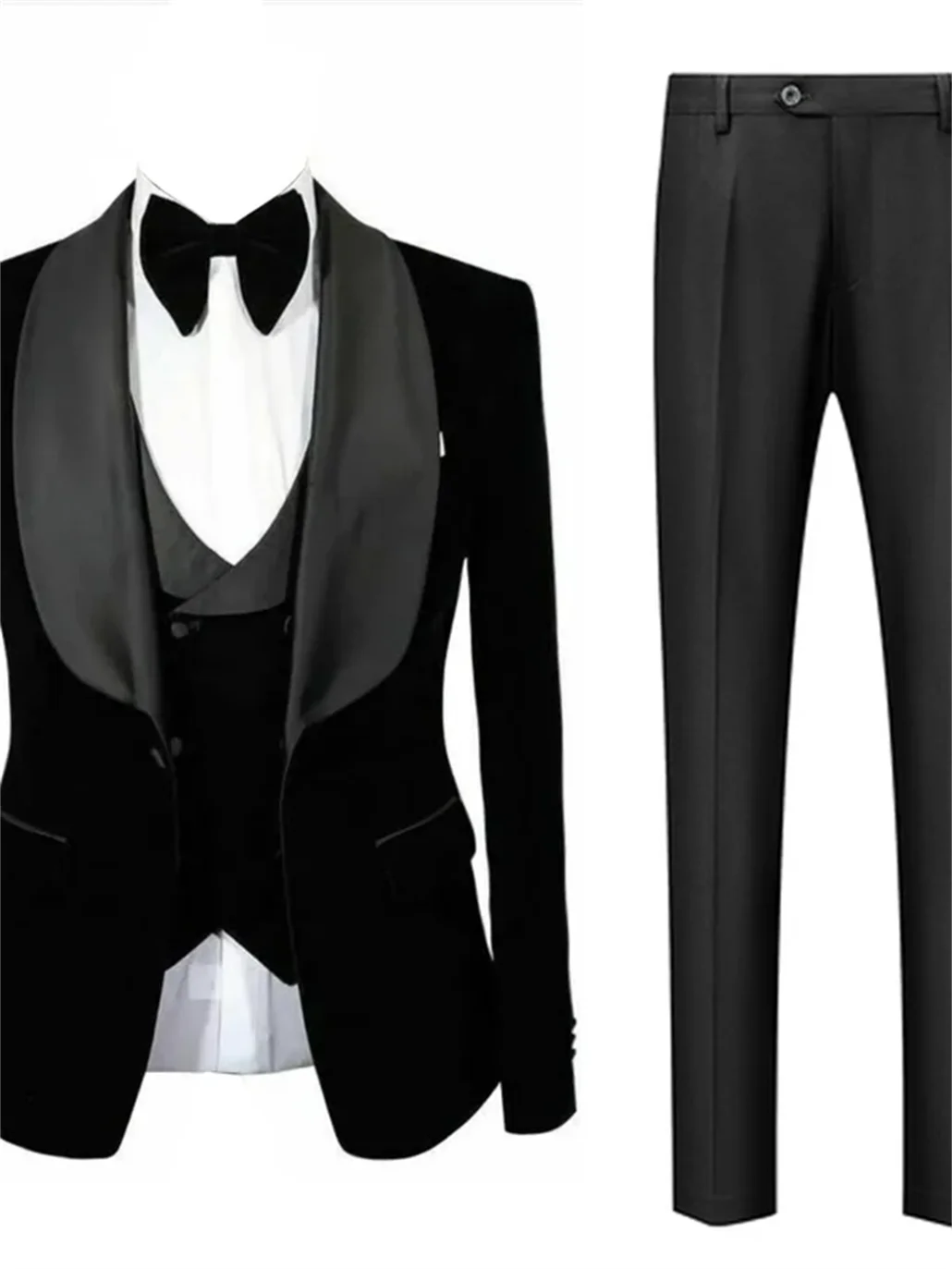 3 Pieces Men's Suit Black Velvet Jacket Vest & Black Pants Shawl Lapel Wedding Prom Dinner Banquet Groom Tuxedos