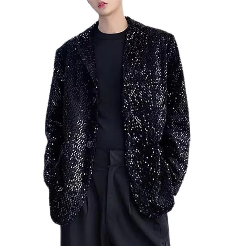 Mens Casual Sequin Suit Jacket Bling Loose Blazer 2025 Spring Autumn Notched Lapel Two-buttons Single Breasted Men Black Coat