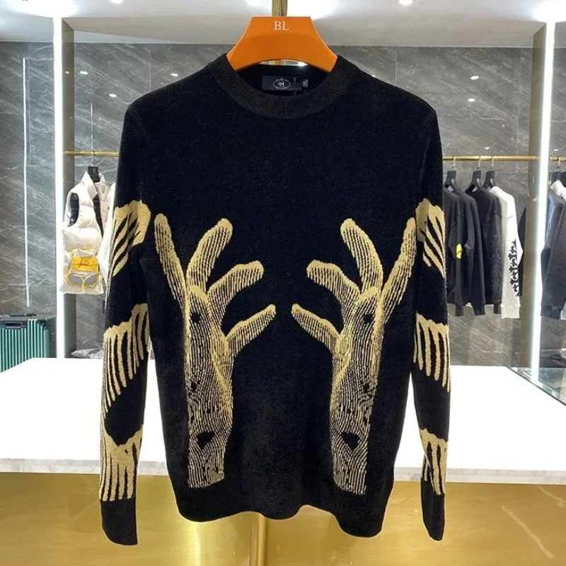 Men's Clothing Crewneck Hippie Graphic Black Pullovers Knit Sweater Male Round Collar Warm Korean Style Elegant Maletry Fun Old