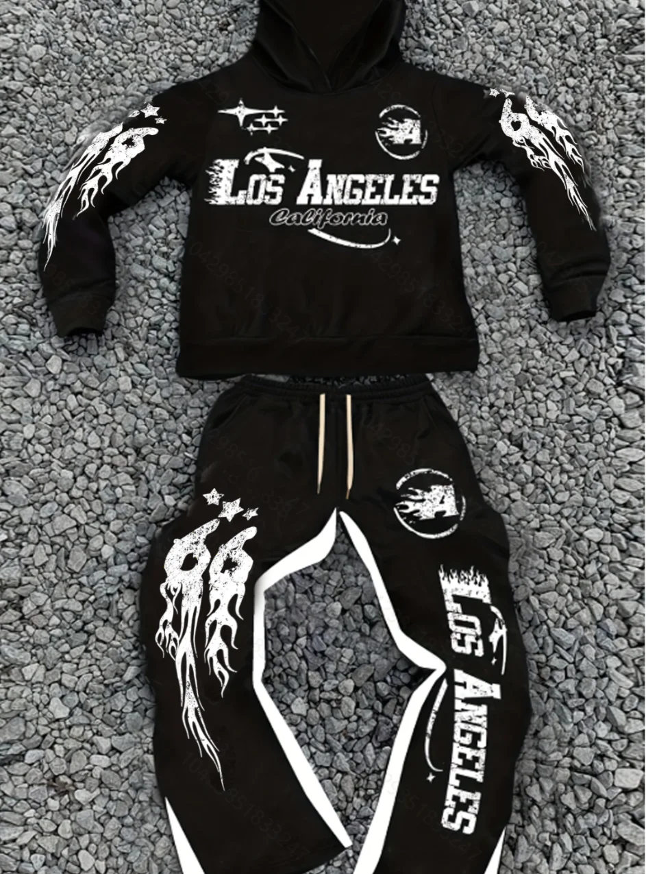 Men's Street - style Casual and Stylish Hooded Set with Black - and - White Color Blocking and Los Angeles Alphabet Print