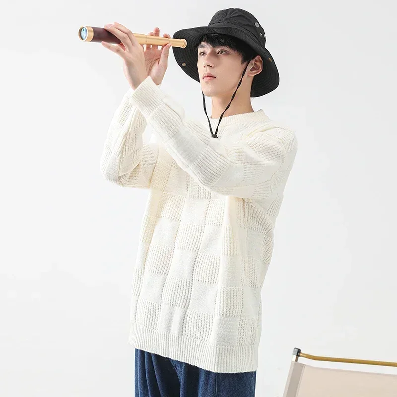 2025 New Men's Casual Sweater Round Neck Long Sleeve Knitted Sweater Diamond Pattern Fashion Versatile Top