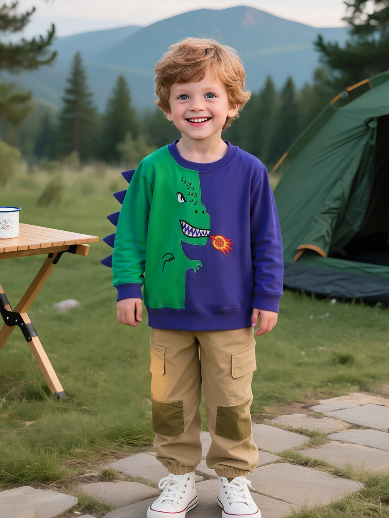 Boys' pure cotton long-sleeved round-neck sweater with color-block dinosaur pattern, fashionable outdoor casual pullover shirt