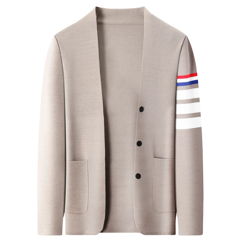 High end brand knitted cardigan men's spring and autumn new classic stripe trend Korean casual side slit V-neck sweater coat