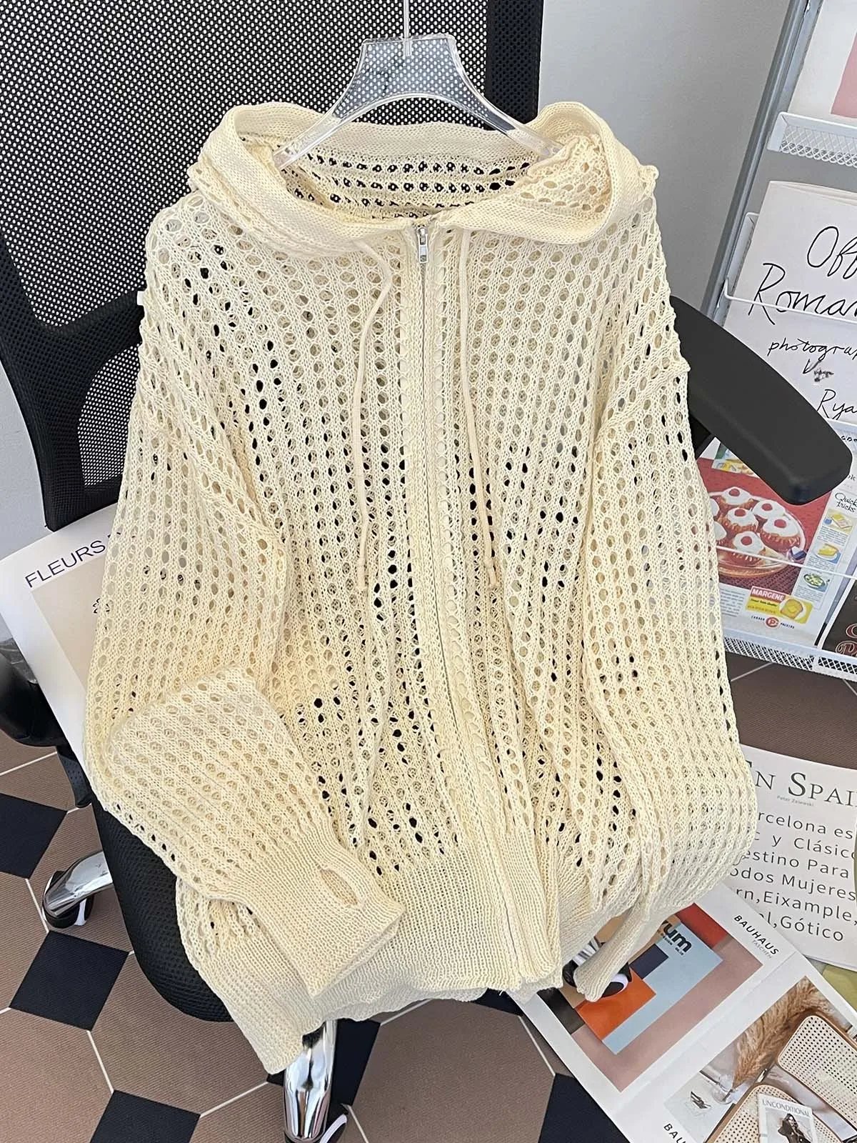 Retro Hollow out Knitted Zipper Hoodie ex Summer Cardigan Pure Color Japanese Sle Design Sensation Casual Wear for Teens