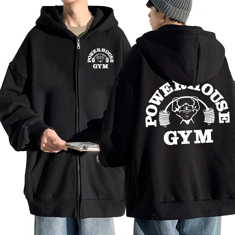 Powerhouse Gym Logo Zip Up Hoodie Harajuku Men's Geek Fitness Cardigan Loose Long Sleeve Punk Sports Sweatshirt Streetwear Male