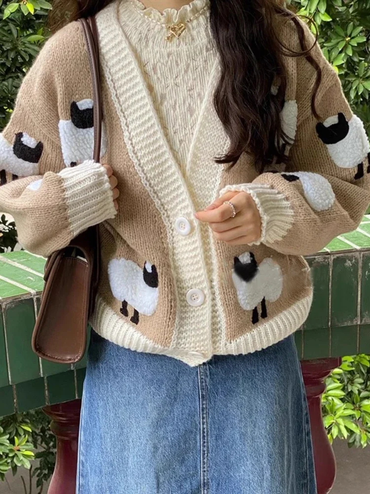 Sheep Pattern Crochet Chunky Knit Cardigan Cute Cartoon Sweater Vintage Long Sleeve V Neck Autumn Women Jumper Outerwear