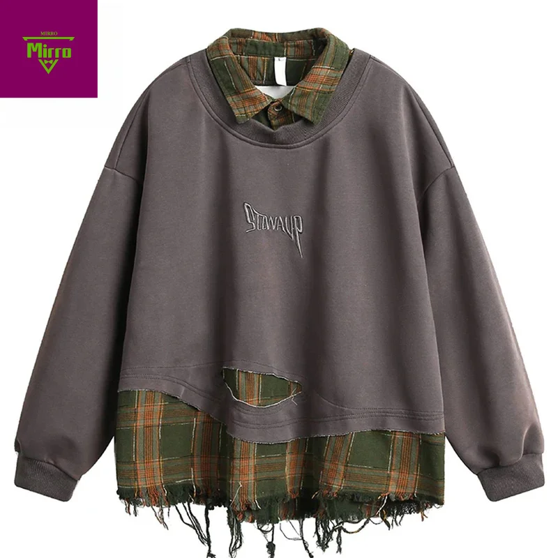 Plaid Splicing Sweatshirt Men Oversized Harajuku Hip Hop Streetwear Pullover Hoodie Fake Two Piece Loose Y2K Hoodie Male