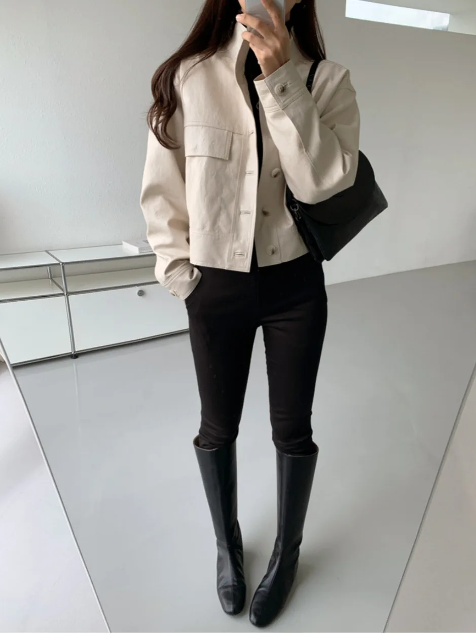 Chic Simple Autumn Long Sve Stand Collar Single Button Loose Casual Biker Jaet Outerwear Versatile Open Cardigan Leather...