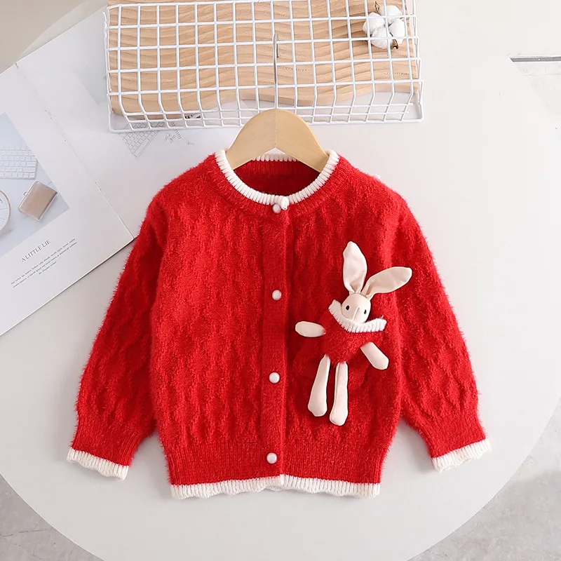 Girls' Sweater Spring Autumn Thickened Round Neck Cartoon Pocket Rabbit Coat Girl Cute Soft Knitted Top Warm Sweater Cardigan  Read more