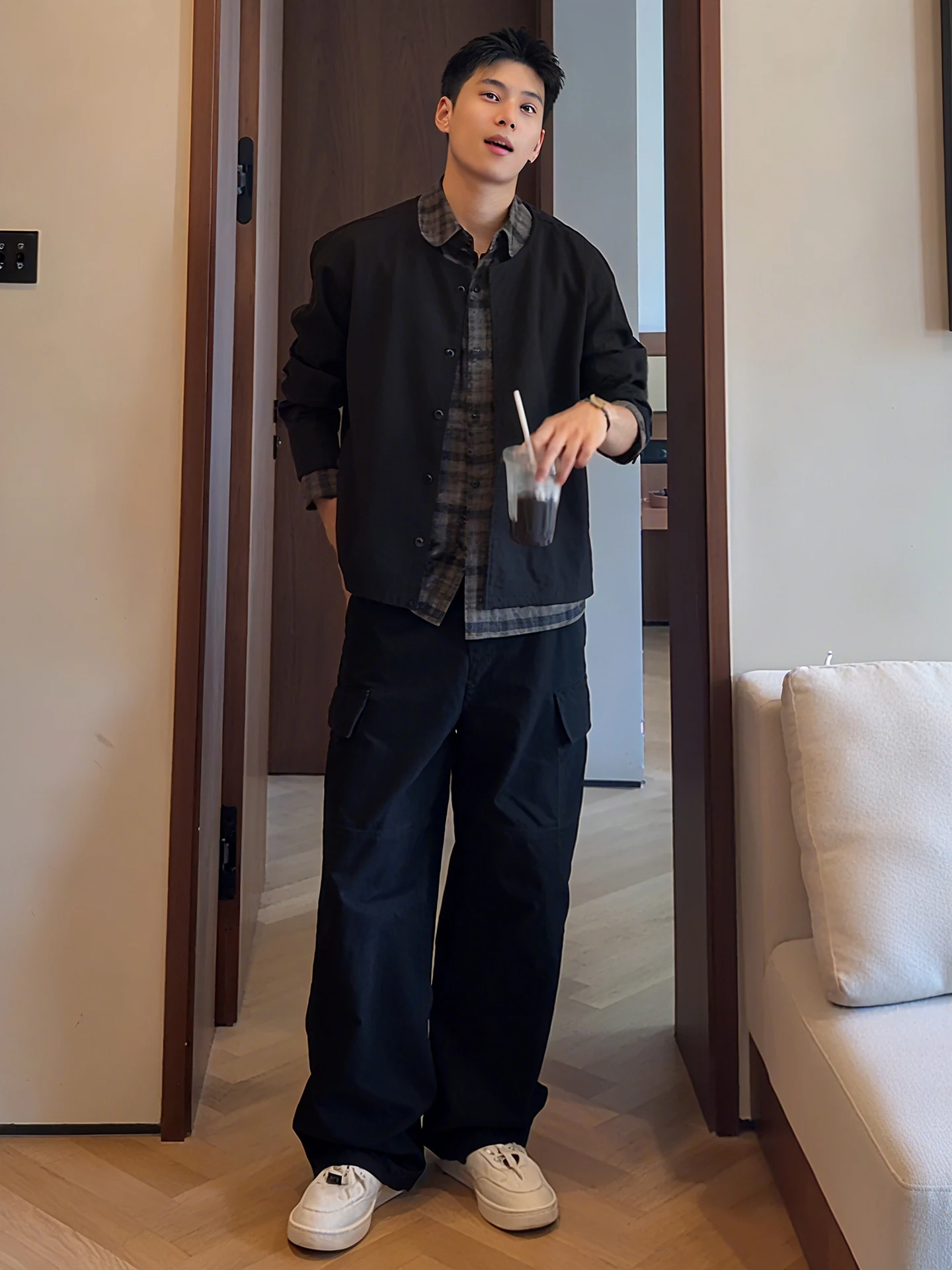 Bla Plaid irt Collar Sweatirt Men's Korean Sle Autumn Faion Cleanfit Open Cardigan Jaet Loose Fit Long Sve