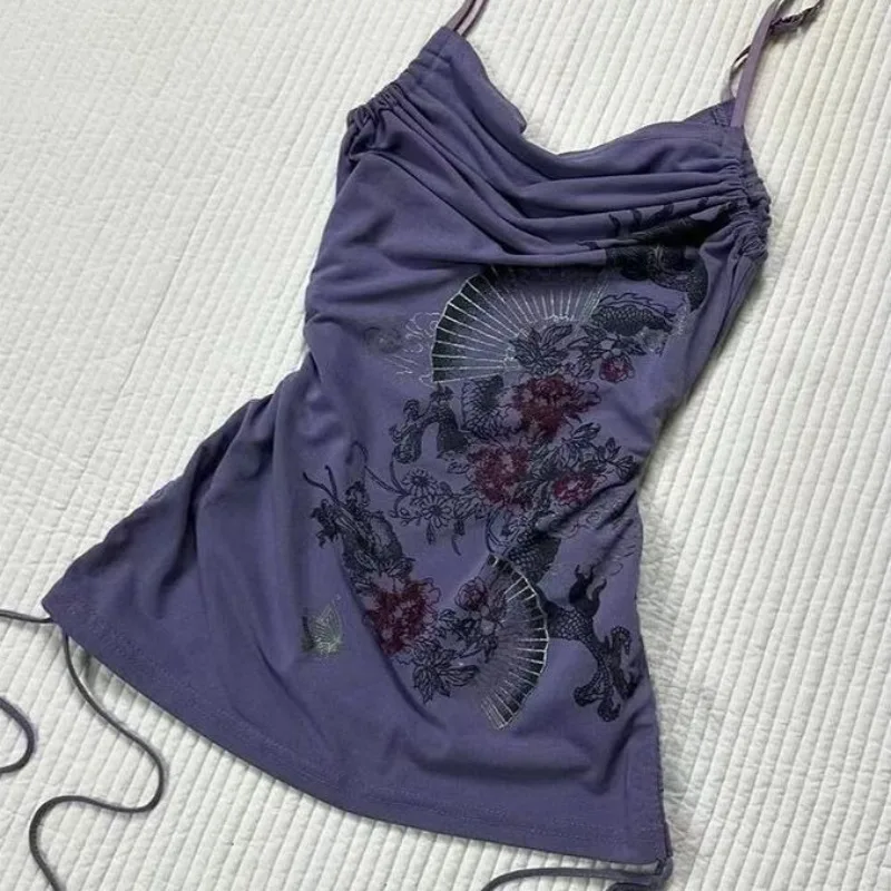 Subcultural Hottie Halter Vests Japanese 2000s Y2k Purple Printed Camisole Harajuku Korean Kpop Women's Tanks Vintage Sexy Tops