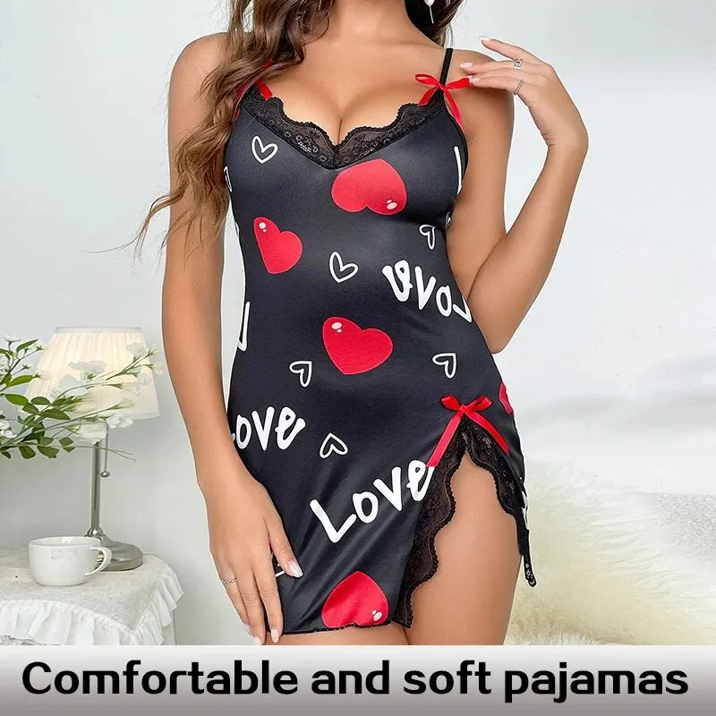 Lace Edge V-Neck Sling Side Split Sleepwear Women's Printed Love Letter Black Home Sling Dress Pajamas  Read more
