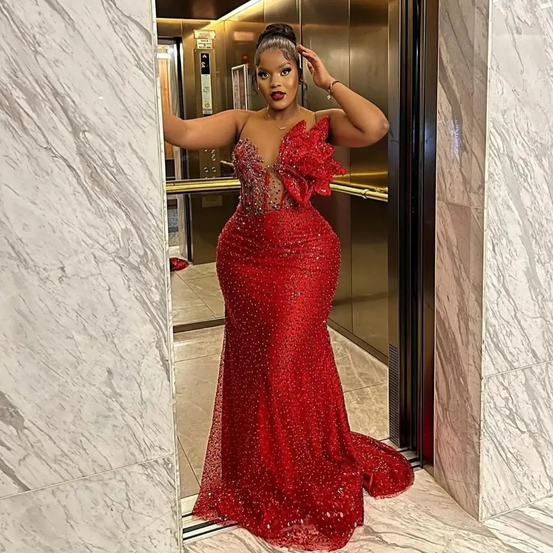 Plus Size African Red Evening Dresses Sparkly Beading Sequins Lace Aso Ebi Style Formal Dress Ruffled Flower African Party Gowns