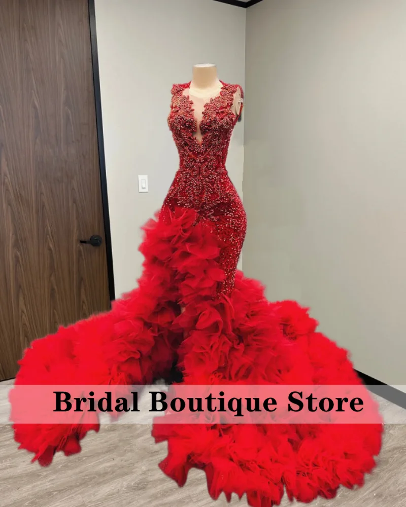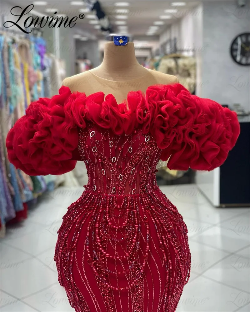Haute Couture Red Mermaid Party Dress Beads Crystal Arabic Ruffles Saudi Arabia Women Evening Gown Customized Long Prom Dresses