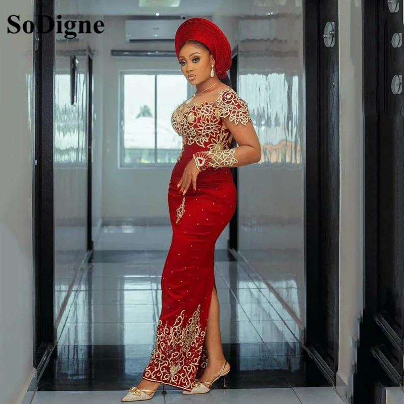 SoDigne Mermaid Red Evening Dress Short Sleeves African Gold Lace Appliques Lace up Saudi Arabic Formal Prom Gowns Customized