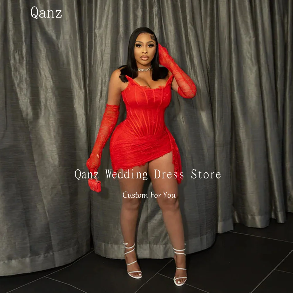 Qanz Sexy Short Prom Dresses Red Lace Appliques Mermaid Lace Up back Party Gown Mini ladies Dresses Special Occasions Customized