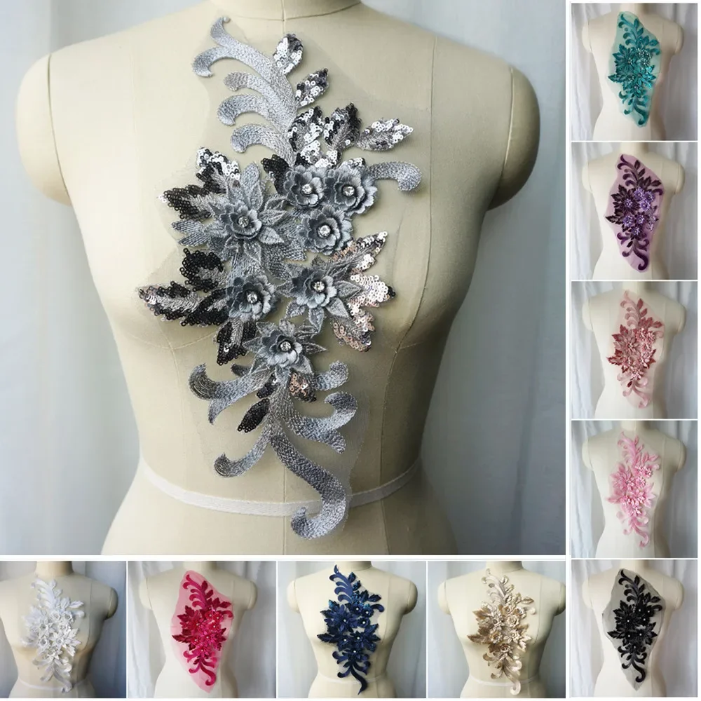 Gold Silver Blue Red Lace Fabric Sequin 3D Flowers Rhinestone Wedding Gown Appliques Embroidery Sew Patch For Dress DIY Decor