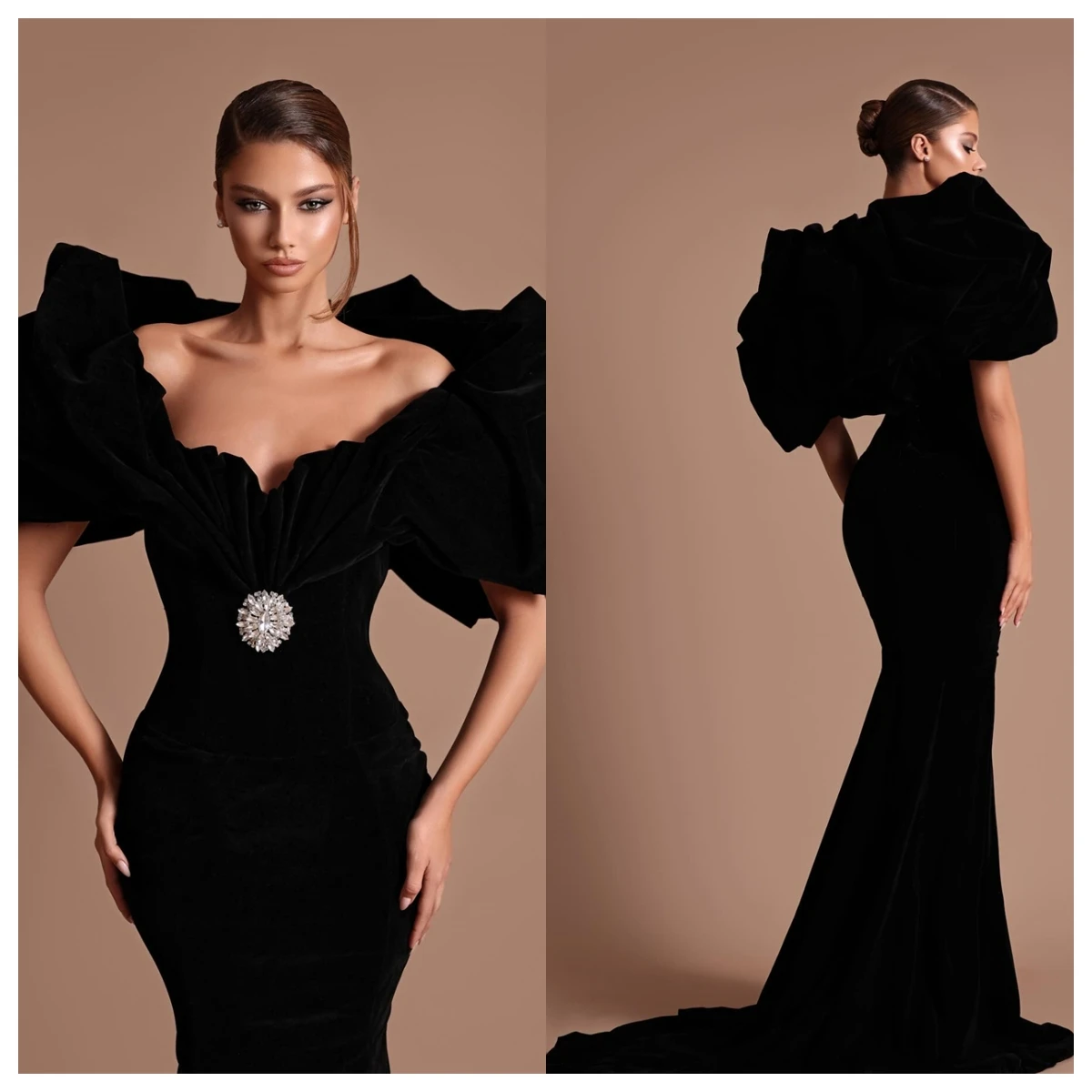 Customized Luxury Black Velvet Evening Dress Square Collar Mermaid Short Sleeves Celebrity Gowns Crystal Vestido De Fe