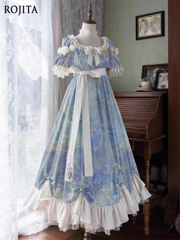 Sweet Court Style Square Neck Dress Women's High Sense 3d Flower Lolita Princess Dress Summer Bubble Short Sleeve Long Dress  Read more