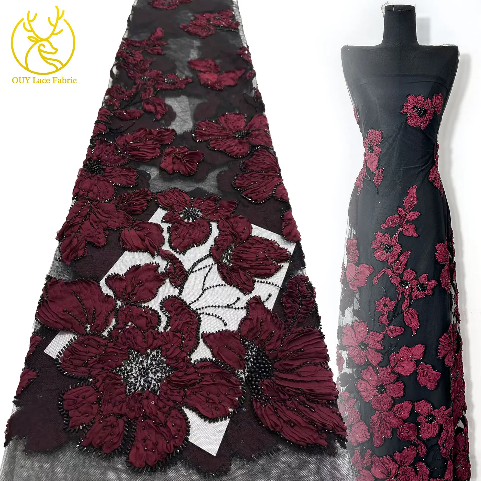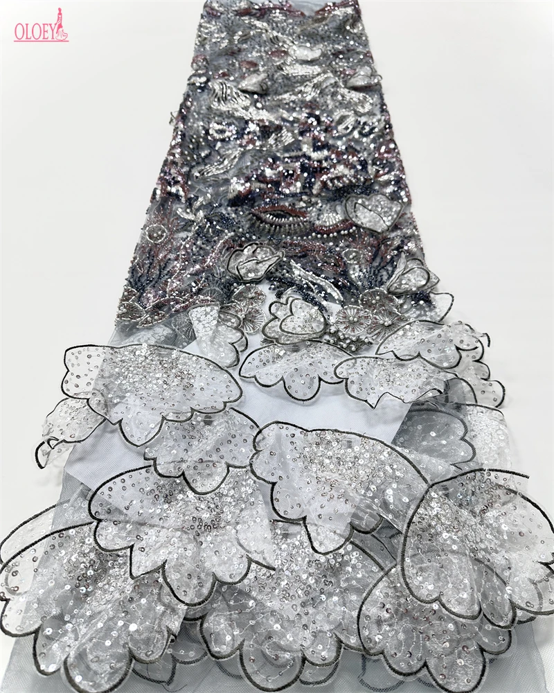 OLOEY African 3D Flower Embroidered Lace Fabric with Beads French Sequins Tulle for Nigerian Wedding Dresses High Quality
