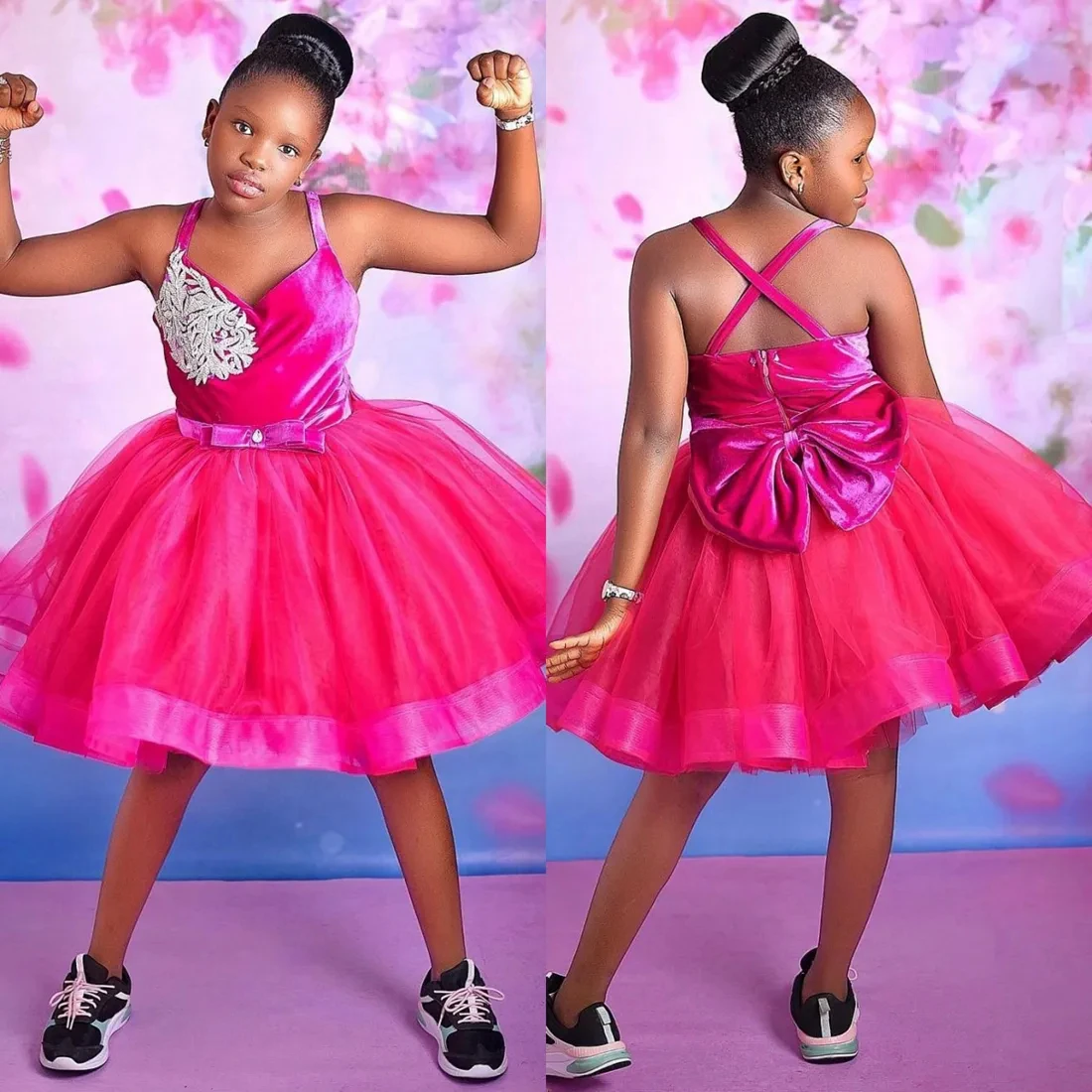 Fuchsia Short Flower Girl Dresses Bow Back Lace Appliqued Flowergirl Dress Knee Princess Baby Kids Girls Birthday Party Gowns  Read more
