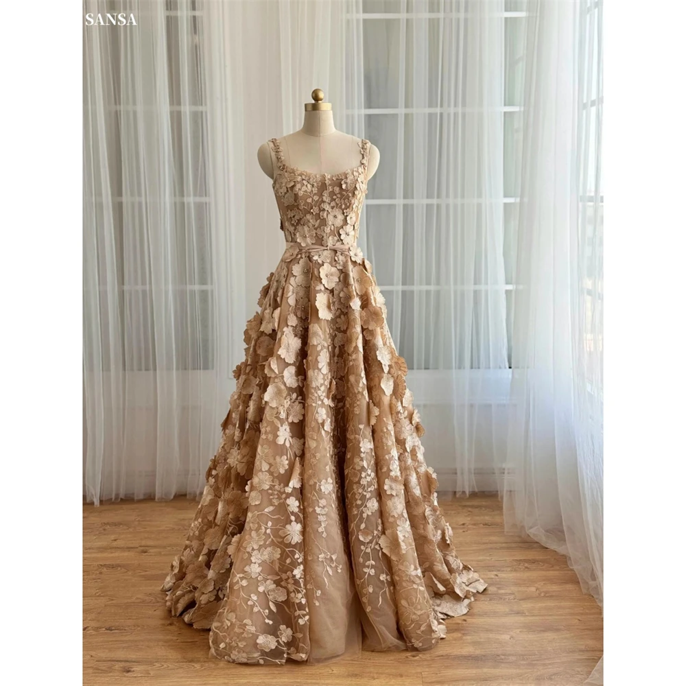 Sansa Customized Brown Flower Embroidery Lace-Up Prom Dress Bow Straps A-Line Vestidos De Noche Floor-Length Formal Evening 2025
