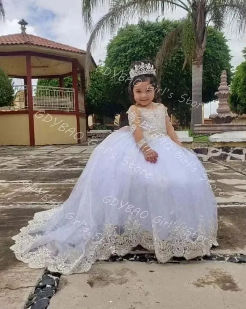 Lace Applique Flower Girl Dress for Wedding Toddlers Full Sleeve Princess Pageant Dress With Bow Kids Custom Birthday Party Gown
