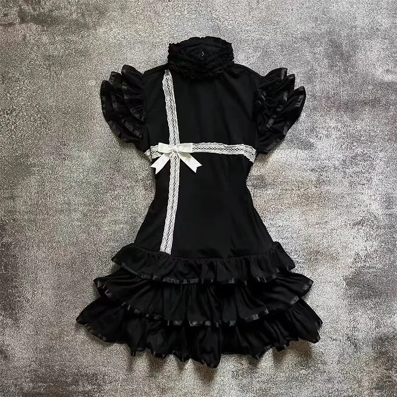 Japanese E-girl Gothic Vintage Dress Women Half High Neck Short Sleeve Bow Lace Mini Dress Cinch Waist Sweet Spicy Black Dress