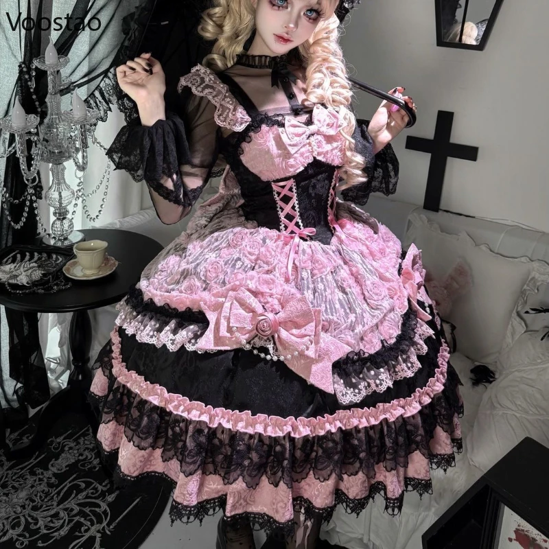 Victorian Gothic Lolita Jsk Dress Women Sweet Bow Lace Ruffle Flower Wedding Party Dress Japanese Vintage Elegant Princess Dress