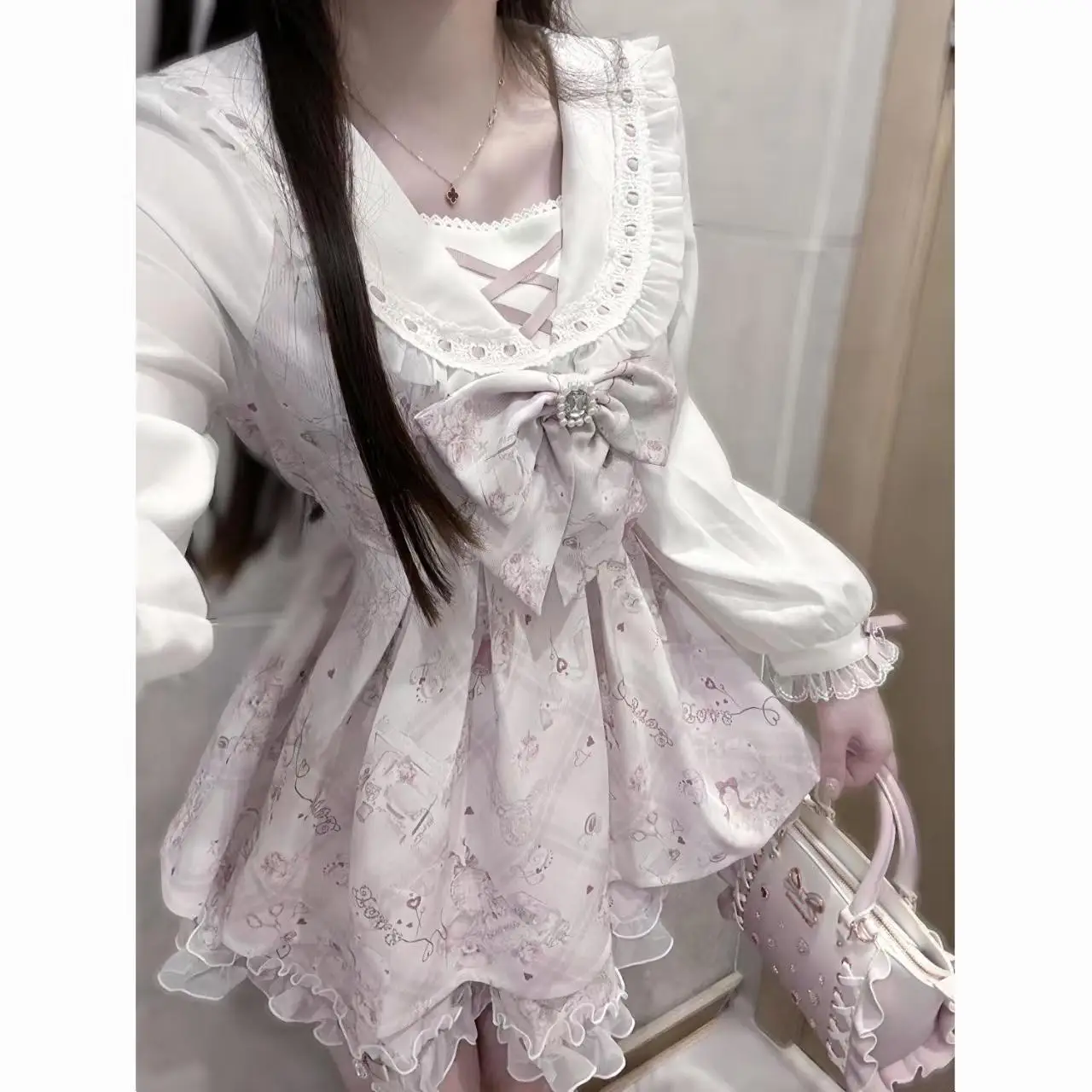 Japanese Sweet Lolita Rhinestone Bow Dress Women Gothic Lace Patchwork Ruffles Slim Dresses Fashion Punk Y2k Party Mini Dress