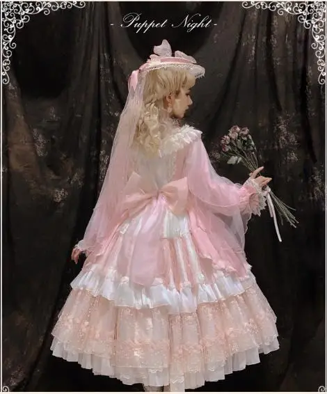 Princess classic lolita dress new palace style heavy lace bow long sleeve Pink Vintage one piece princess dress FISH001