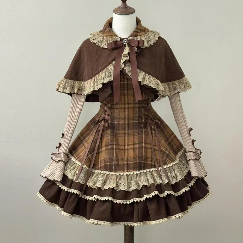 Autumn Winter Lolita Style 3 Piece Set Women Lace Bow Peter Pan Collar Cloak Coat Plaid Mini Dress Korean Fashion Y2k Sweet Suit