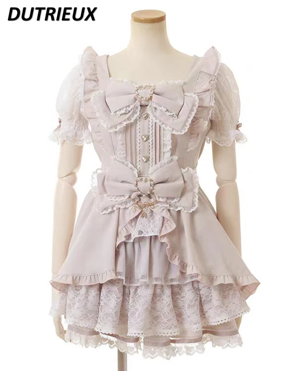 Japanese Cute Girl Mass-produced Square Neck Short-sleeved Slim-fit Dress Sweet Bow Lace Ruffle Edge Dresses and Base Skirt
