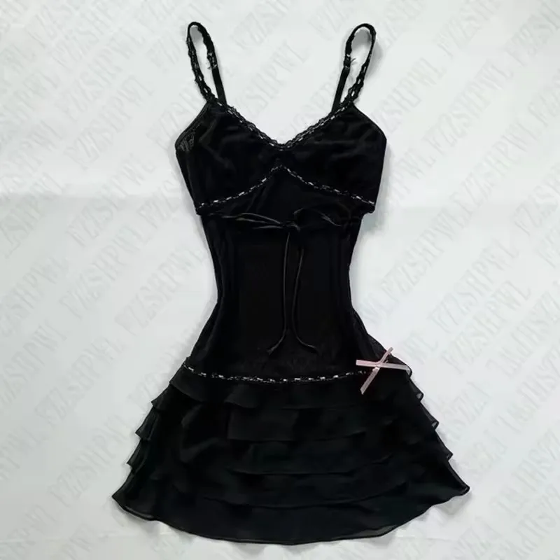 Japanese E-girl Gothic Vintage Dress Women Half High Neck Short Sleeve Bow Lace Mini Dress Cinch Waist Sweet Spicy Black Dress