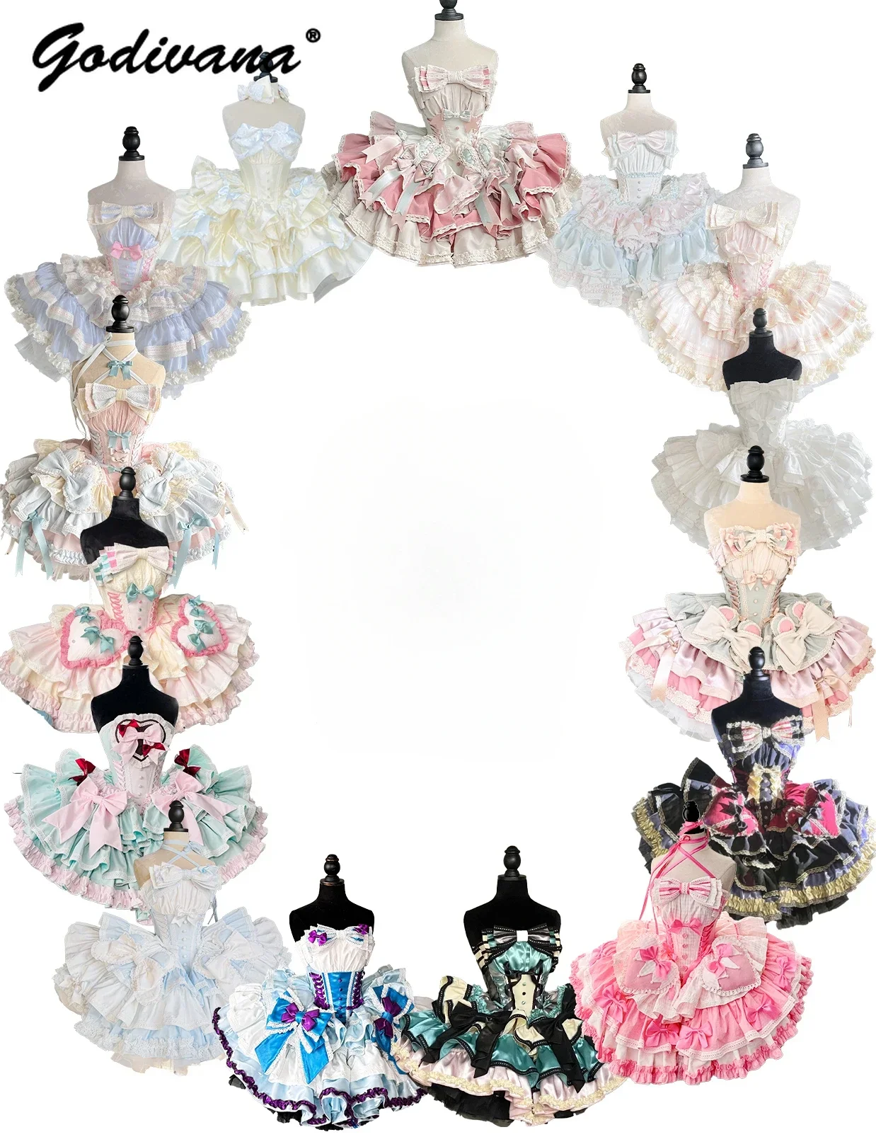 New 2025 Spring Summer Sweet Girl Women's Lolita Strapless Princess Dress Big Bow Lace Ruffled Pettiskirt Mini Party Dresses