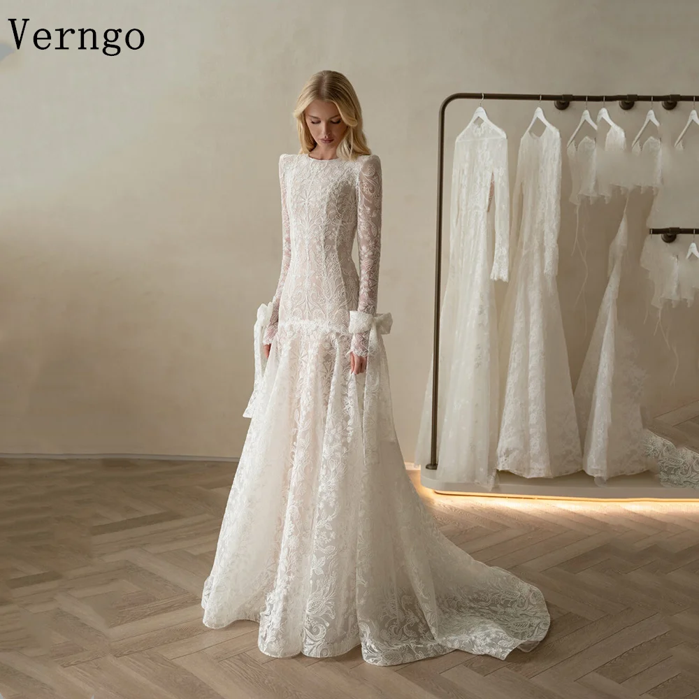 Verngo lvory Lace Evening Dress O Neck Full Sleeves Bow Mermaid Formal Occasion Dresses Sweap Train Modest Prom Gown Customized