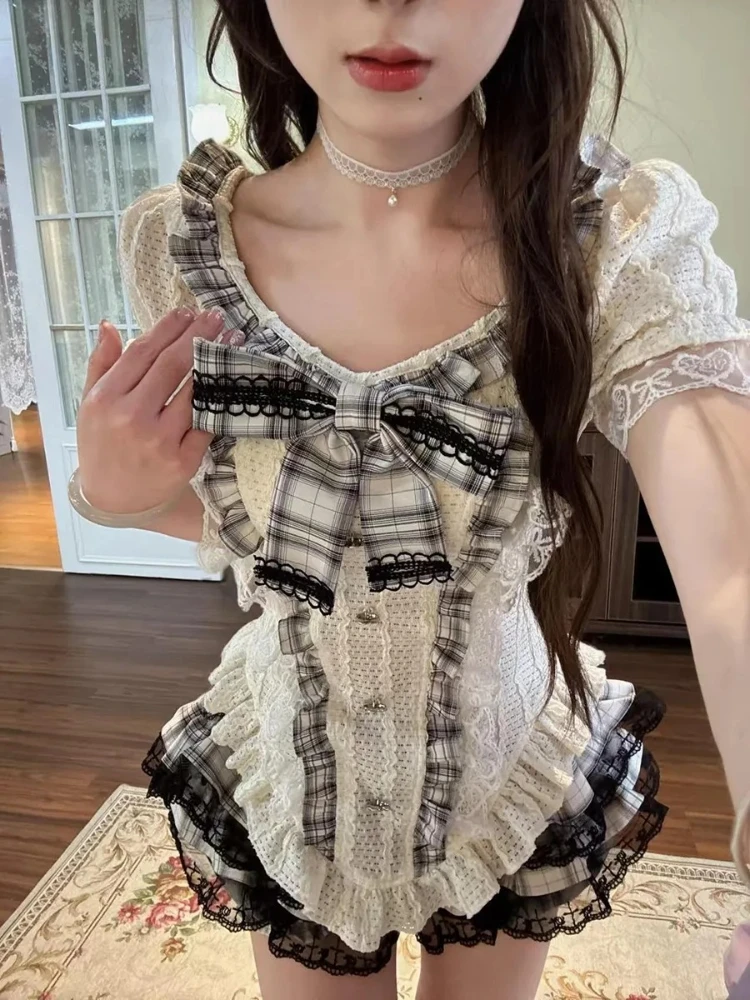 High Street Fashion Sweet Slim 2-piece Set Women Elegant Casual Lace Short Sleeve Bow Tops Female + High-waist Plaid Short Skirt