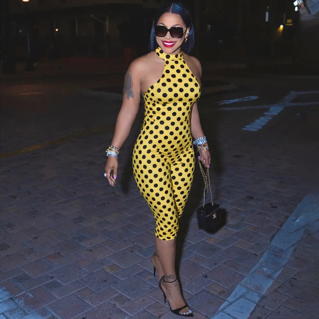 Polka Dots Print Lace Up Halter Backless Skinny Knee Length Jumpsuits Women Sexy Sleeveless Ruched Peach Hips Rompers Overalls