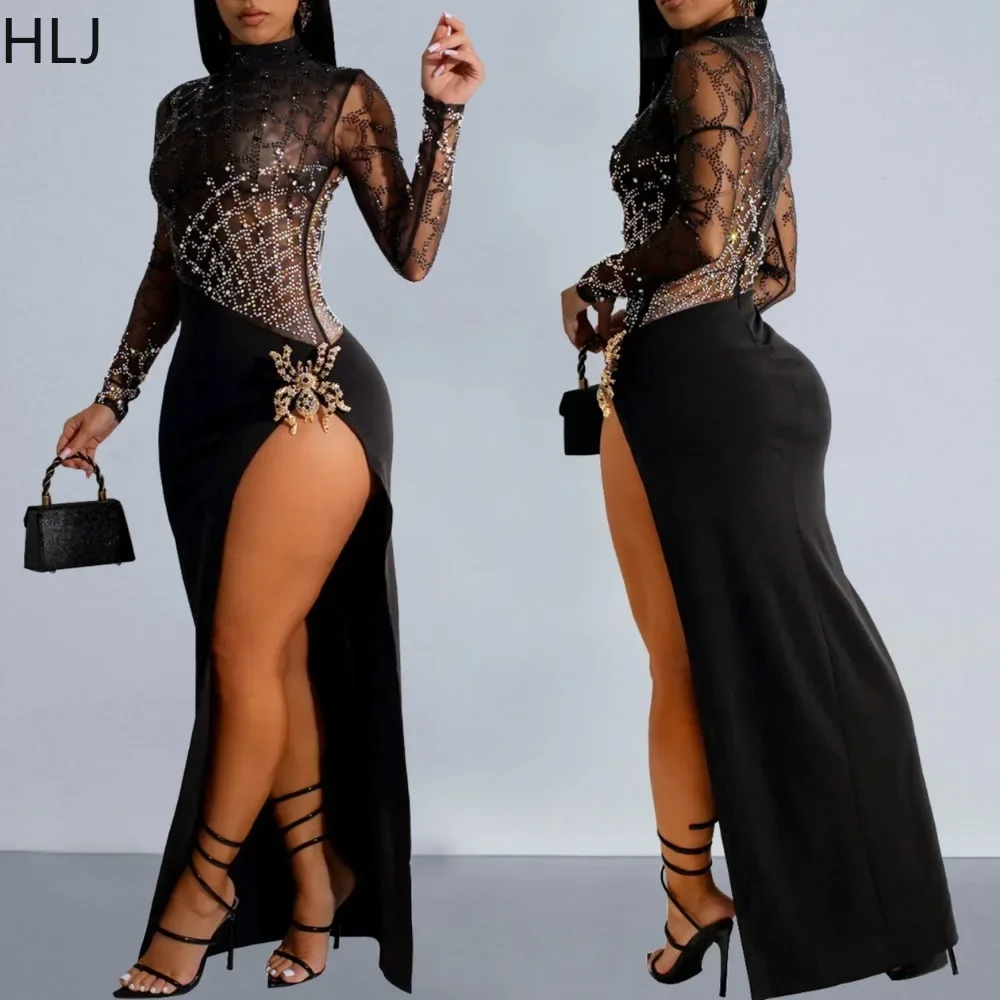 HLJ Fashion Luxury Rhinestone Mesh See Though Evneing Party Long Dresses Women Round Neck Long Sleeve Slim Vestidos Sexy Clothes